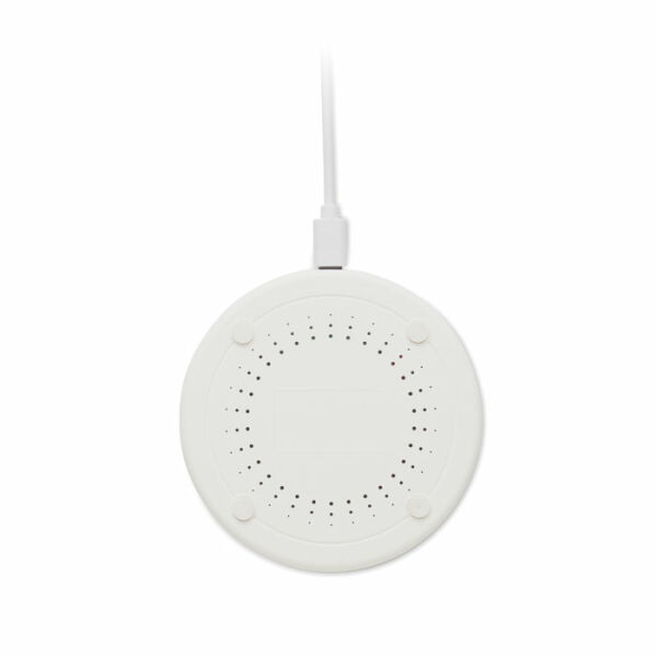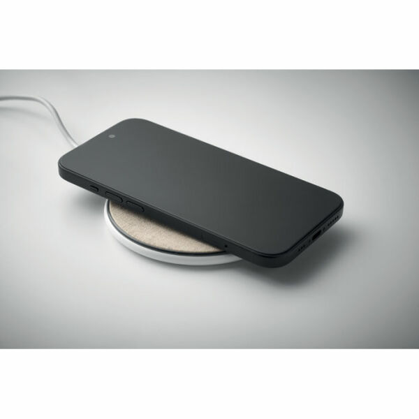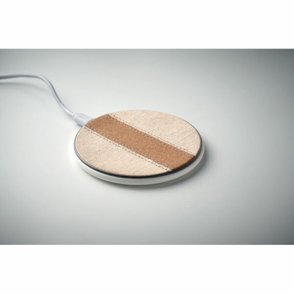 Draadloze oplader van gerecycled ABS met details van katoen en kurk. Sluit hem aan op je computer, leg je smartphone erop en laat hem opladen. Uitgang: DC 9V/1 ,67A (15W).