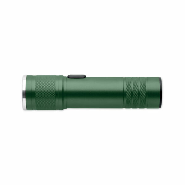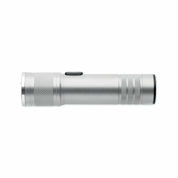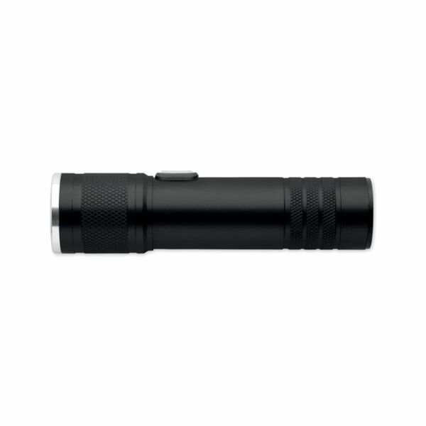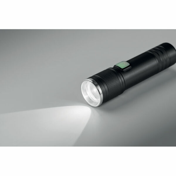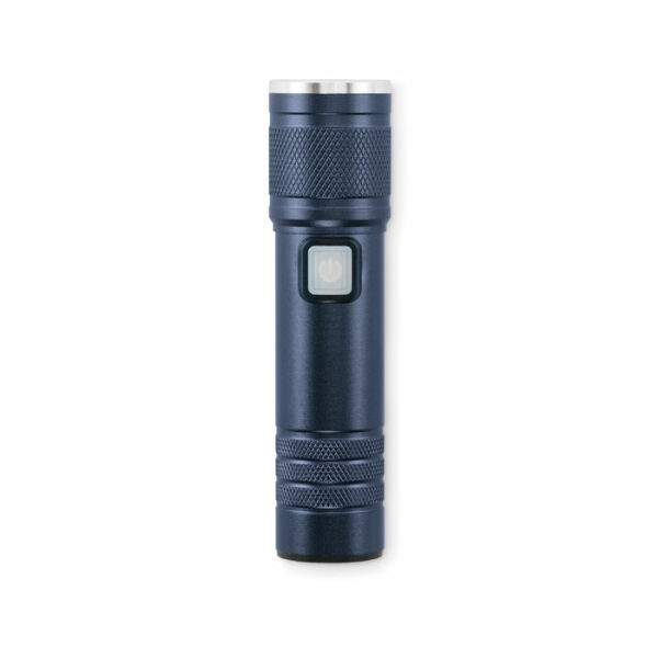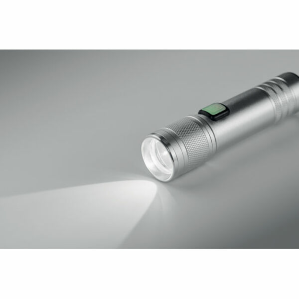 Oplaadbare en uitbreidbare COB zaklamp van gerecycled aluminium. 100 lumen met 3 lichtstanden en zoomfunctie. Ingebouwde oplaadbare batterij van 800 mAh. Inclusief oplaadkabel.